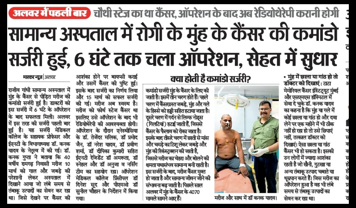 Mouth cancer got operated in Rajeev Gandhi Hospital , Alwar in ENT departement by Dr. Kanak Yadav .